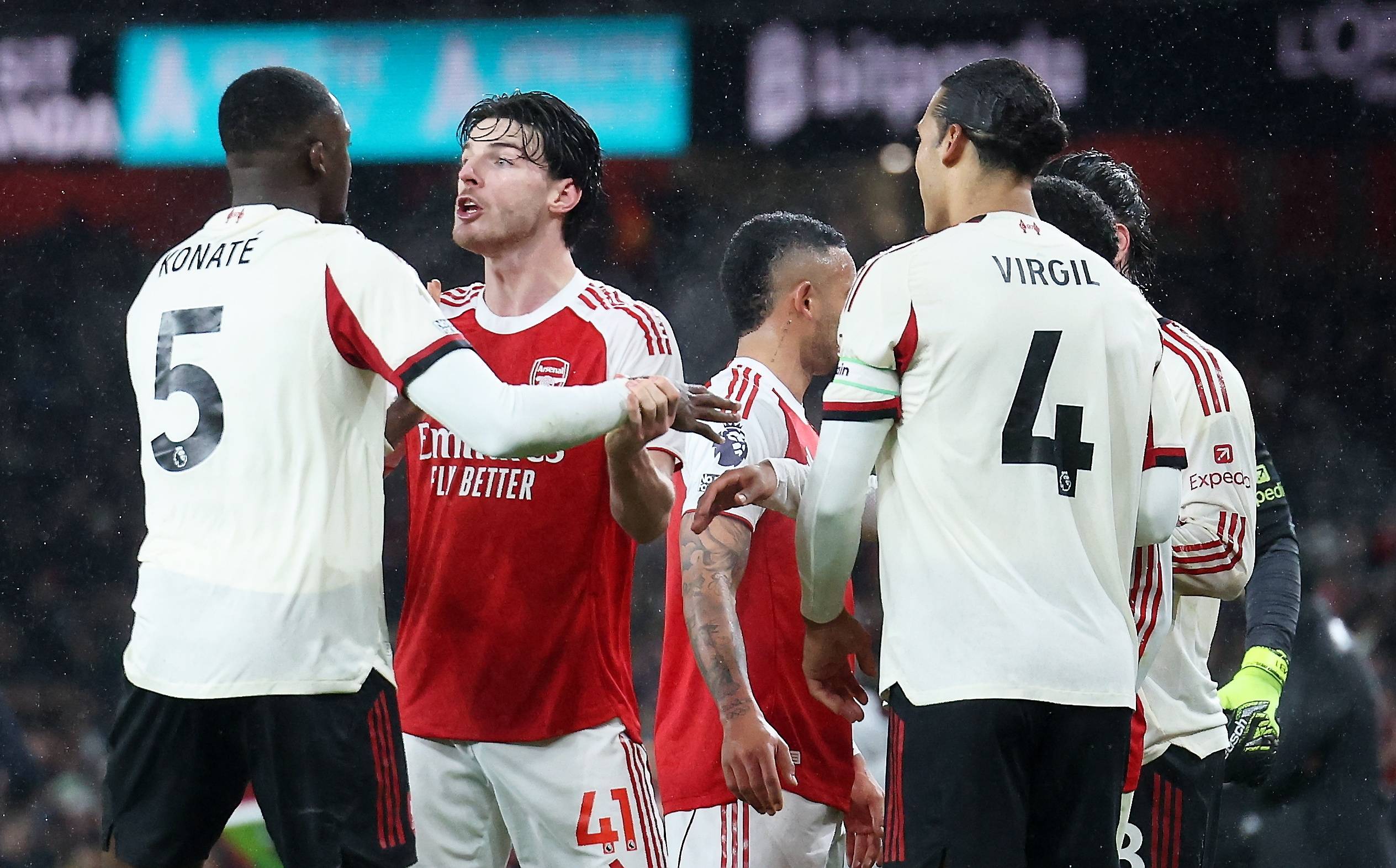 1月8日,阿森纳队球员赖斯(左二)与利物浦队球员科内特交谈。 新华社/欧新